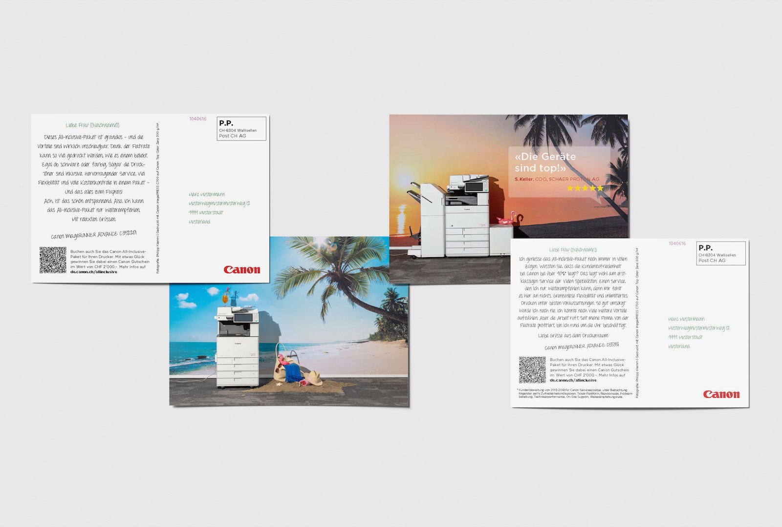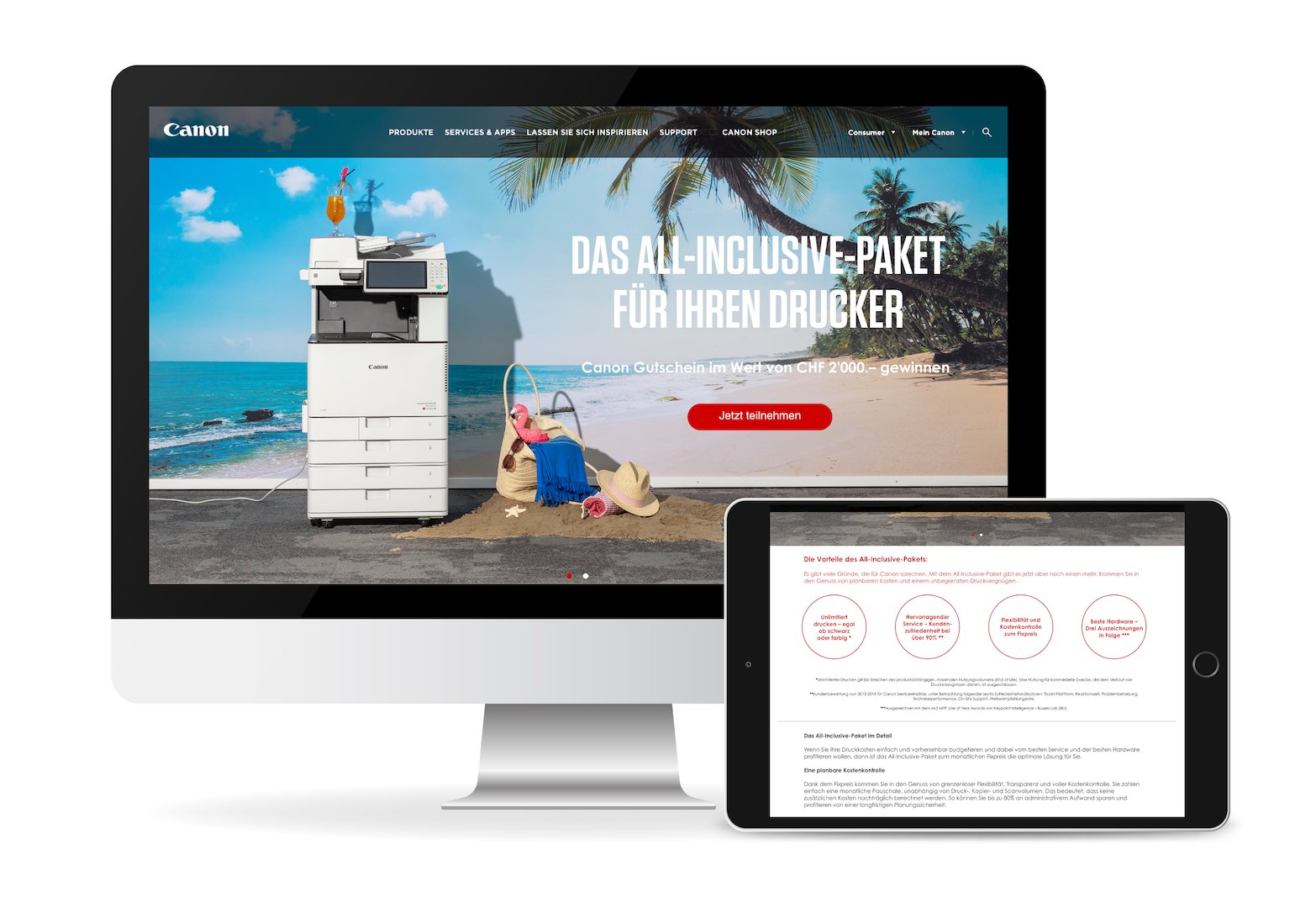 Wir haben, passend zum neuen Service «Druckerflatrate», eine All-Inclusive Omnichannel-Kampagne kreiert, die über alle Touchpoints hinweg zielgruppenspezifisch und automatisiert ausgespielt werden konnte. Die Keyvisuals wurden in Analogie zum altbekannten All-Inclusive-Angebot von Reiseveranstaltern gehalten, um eine vermeintlich trockene und komplexe Serviceleistung frisch und schnell fassbar darzustellen. Um die Zielgruppe optimal mit Impressions bedienen zu können, haben wir die Kampagne zusammen mit iundf Marketing Technology so konzipiert und in einer Marketing Automation Software aufgebaut, dass alle Werbemittel – online und offline – automatisiert und punktgenau, mit unterschiedlichen Botschaften und zu einem jeweils bestimmten Zeitpunkt entlang der Customer Journey ausgespielt werden konnten.