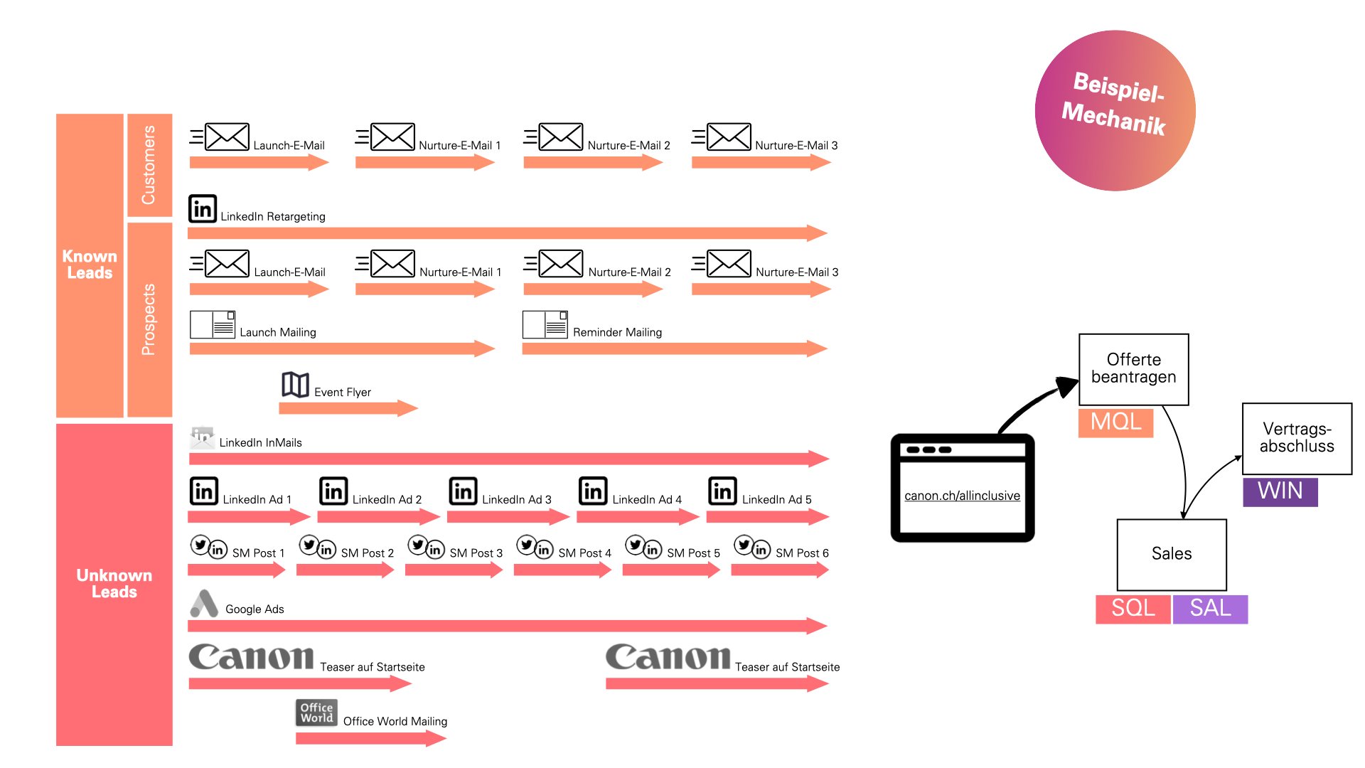 Auch in einer faktischen und erfolgsorientierten B2B-Welt muss man auffallen, um wahrgenommen zu werden. Canon wollte ihre Service-Innovation differenziert bewerben, in der einheitlichen Business-Kommunikation herausstechen und dabei ihr beschränktes Budget mit maximalem Output einsetzen. Das Ziel: Leads zu generieren, die vom Sales weiterbearbeitet und erfolgreich zu Kunden konvertiert werden können.