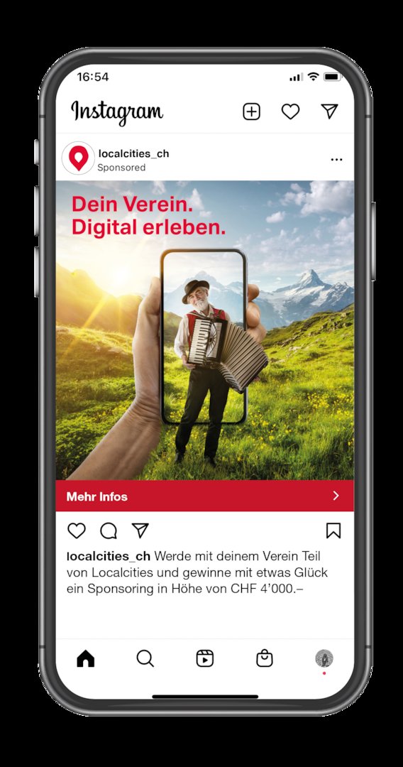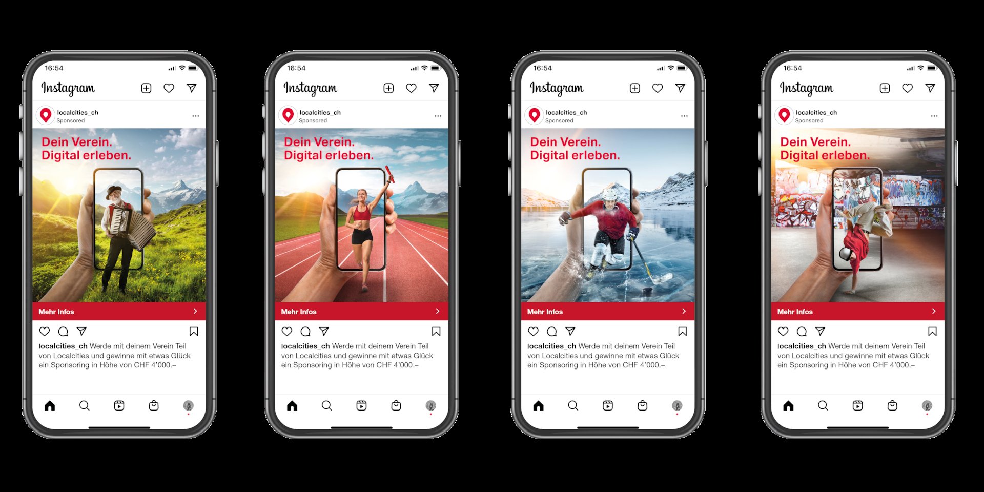 Unter einem digitalisierten Verein stellt man sich, nicht weiter verwunderlich, erstmal nicht viel vor. Wie denn auch, funktionieren die meisten Vereine auch heute noch eher rudimentär. Darum haben wir mit cleveren Visuals auf einen Blick kommuniziert, dass von nun an die ganze Welt der eigenen Leidenschaft ins Smartphone passt. Entstanden sind so 3 Sujets, die nun ihren Weg in die Instagram-Feeds und Banner Ads potenzieller Vereinspräsident:innen, Mitglieder:innen und Interessierten finden. Unterstützend dazu wurde ein Wettbewerb lanciert, der Vereinen die Möglichkeit gibt, die Vereinskasse mit einem guten Sponsoring-Batzen aufzubessern. Um das kommunikative Paket abzurunden, haben wir zusätzlich ein Erklärvideo produziert, das nicht nur die Funktionalitäten, sondern auch die Vorteile für alle Nutzer von Localcities kinderleicht erläutert. Und das natürlich dazu animiert, sich alles einmal etwas genauer anzusehen.