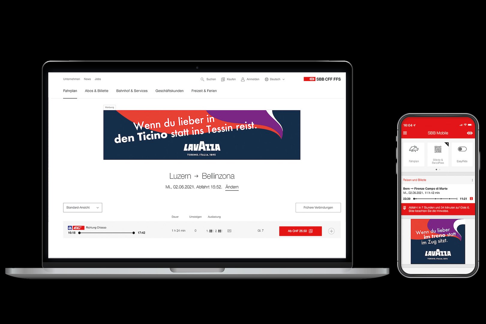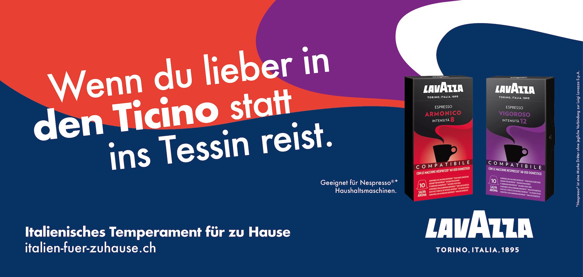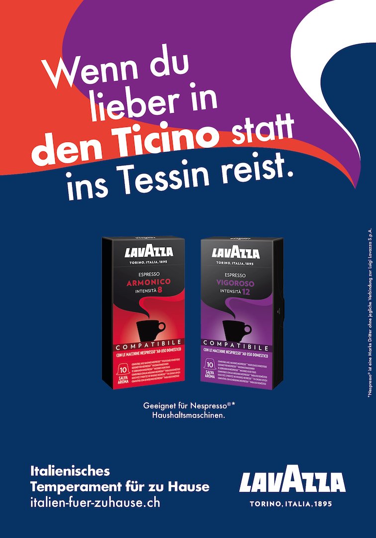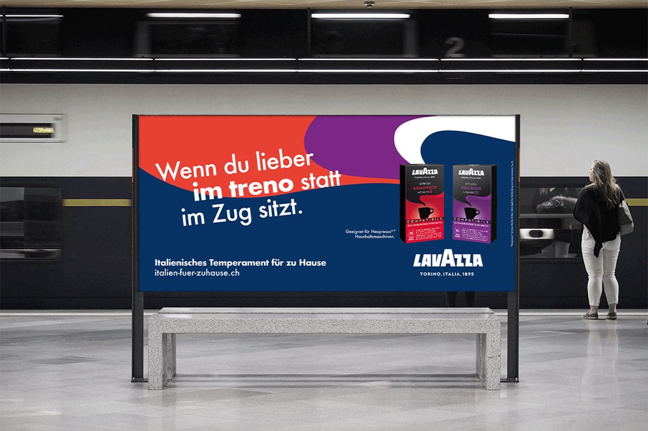 Eine Tasse Lavazza-Kaffee ist wie ein Weckruf für das Leben. Ein kraftvoller Genuss, der die italienische Lebensfreude weckt, auch bei Schweizern. Mit einer umfangreichen Kampagne bringen wir ein bisschen mehr Italianità in den Schweizer Alltag, off- und online. Mit Display Ads, Inseraten, Plakaten, E-Boards sowie einem genussvollen Mailing. Und mit Sonderplakaten, die an verschiedenen Bahnhöfen entlang der Zugstrecke Zürich – Lugano geschalten wurden, und wo in den Headlines auf die Fahrt Richtung Süden eingegangen wird. Die Kampagne führt hoffentlich gleich in den Coop, wo es ein gutes Angebot an Lavazza-Kaffee gibt. Falls aber noch nicht direkt, dann zumindest auf die Microsite italien-fuer-zuhause.ch. Hier wird ein ausgewähltes Angebot von Lavazza präsentiert. Zudem verraten ein paar Tipps, wie man, neben dem Genuss von Lavazza, noch mehr italienisches Temperament in seinen Alltag bringen kann.