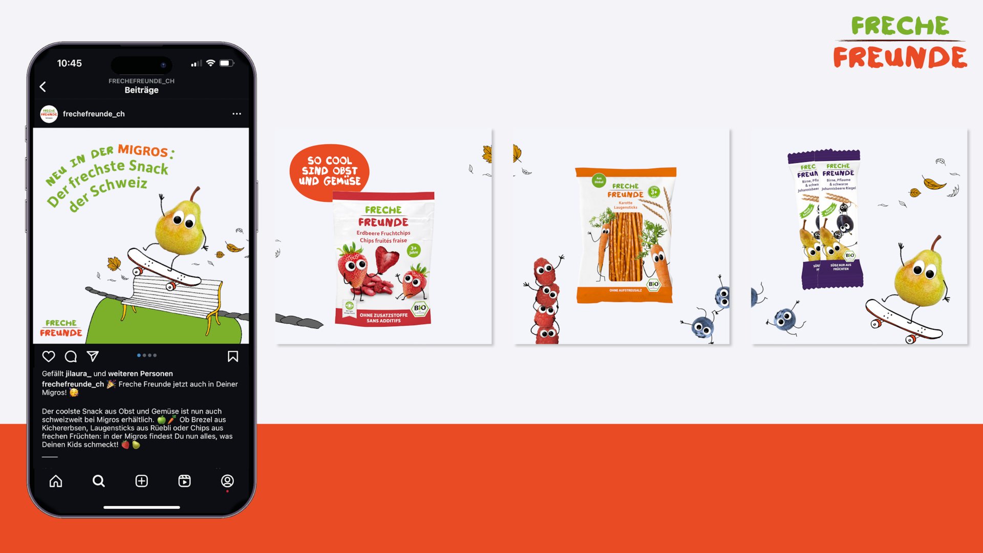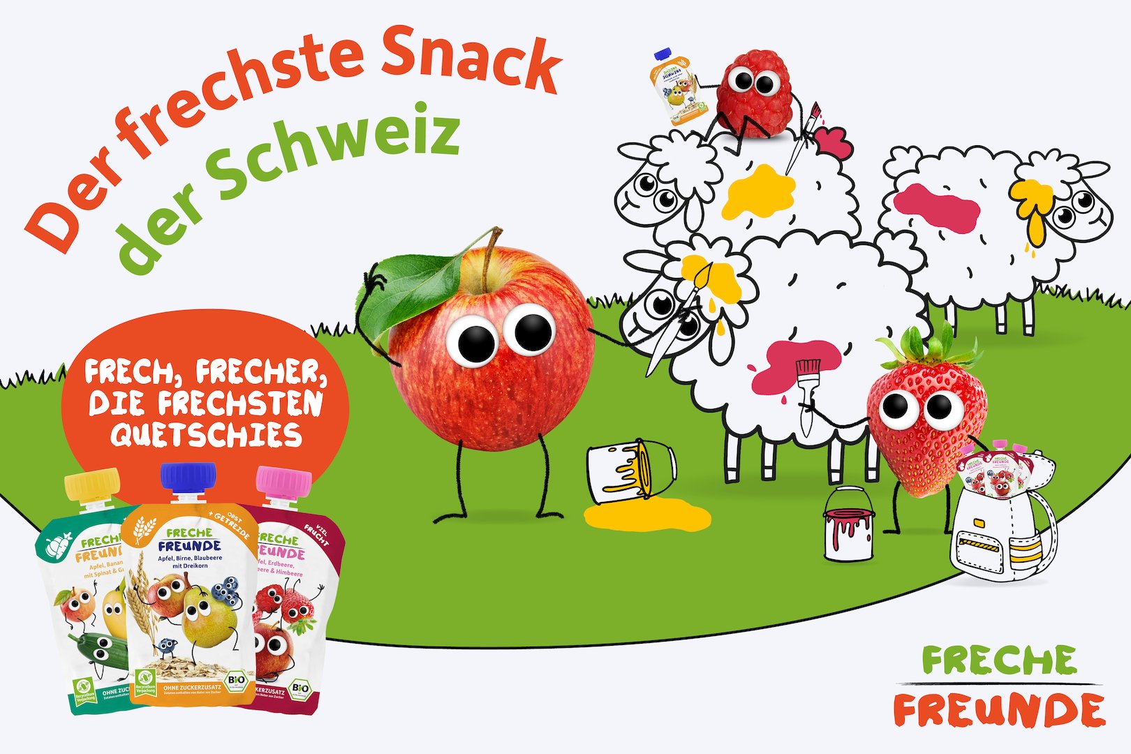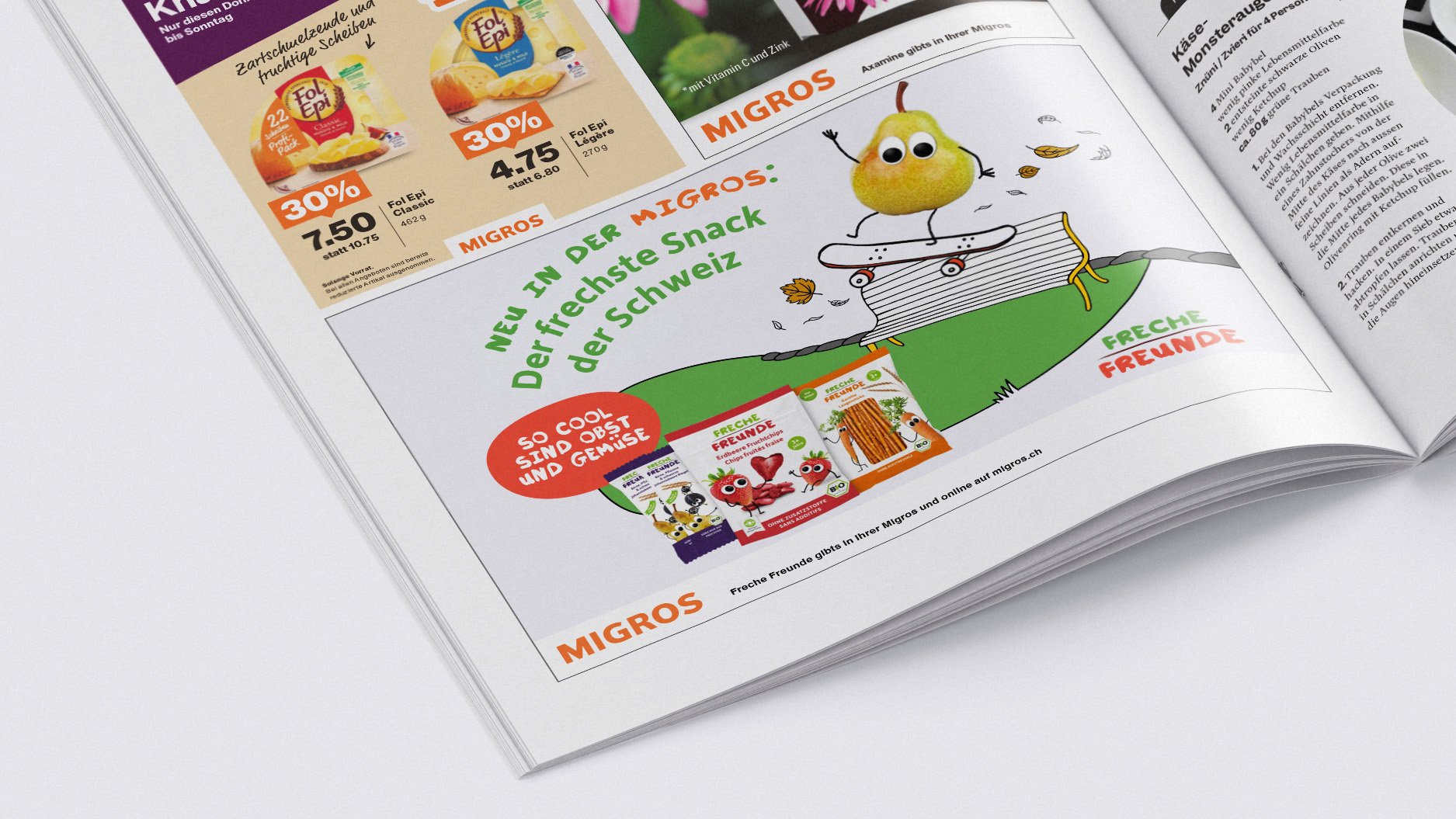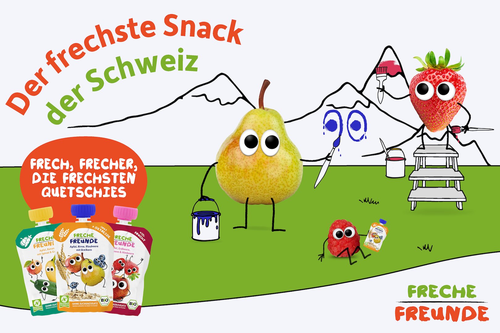 Freche Freunde, der Bio-Kindersnack aus Obst und Gemüse, ist neu auch in der Migros erhältlich. Um diese Botschaft zu verbreiten, haben wir die Frechen Freunde, wie Betty Birne oder Tom Tomate gleich selbst ins Zentrum der Kampagne gestellt. Wir zeigen, wie cool Obst und Gemüse sein können. Ob mit einer schwungvollen Arschbombe im Schwimmbad oder einem crazy Trick mit dem Skateboard. Die Frechen Freunde machen das, was Kindern gefällt – und schmecken auch noch gut dabei!
