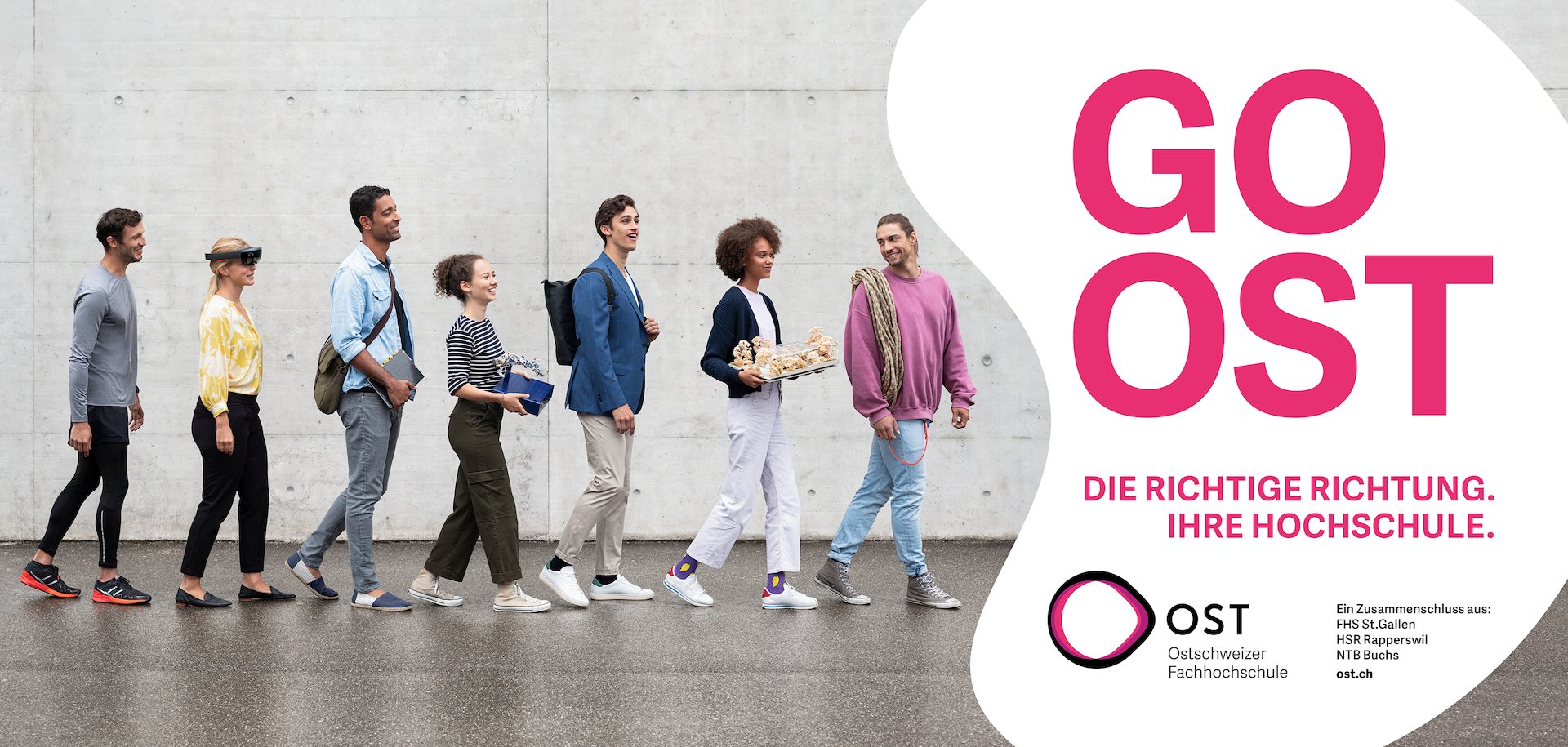 Die Ostschweizer Fachhochschule ist das neue Kind auf dem Pausenhof der höheren Bildungsstätten der Schweiz. Und es kann sich sehen lassen. Die Fusion der drei Fachhochschulen FHS St. Gallen, HSR Rapperswil und NTB Buchs hat einen neuen, starken Bildungshotspot für die Ostschweiz hervorgebracht und vereint Wissen, Kompetenz und Innovation unter einem Dach. Darum galt es zum Launch dieses Grossunterfangens im September 2020, Studierende aufzufordern, sich gen Osten zu wenden und den richtigen Weg zum Abschluss einzuschlagen.