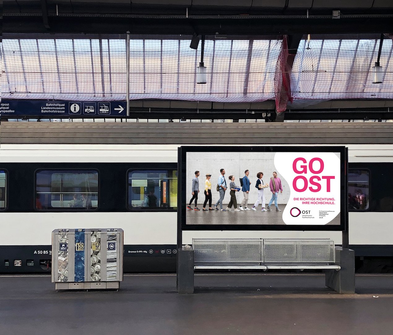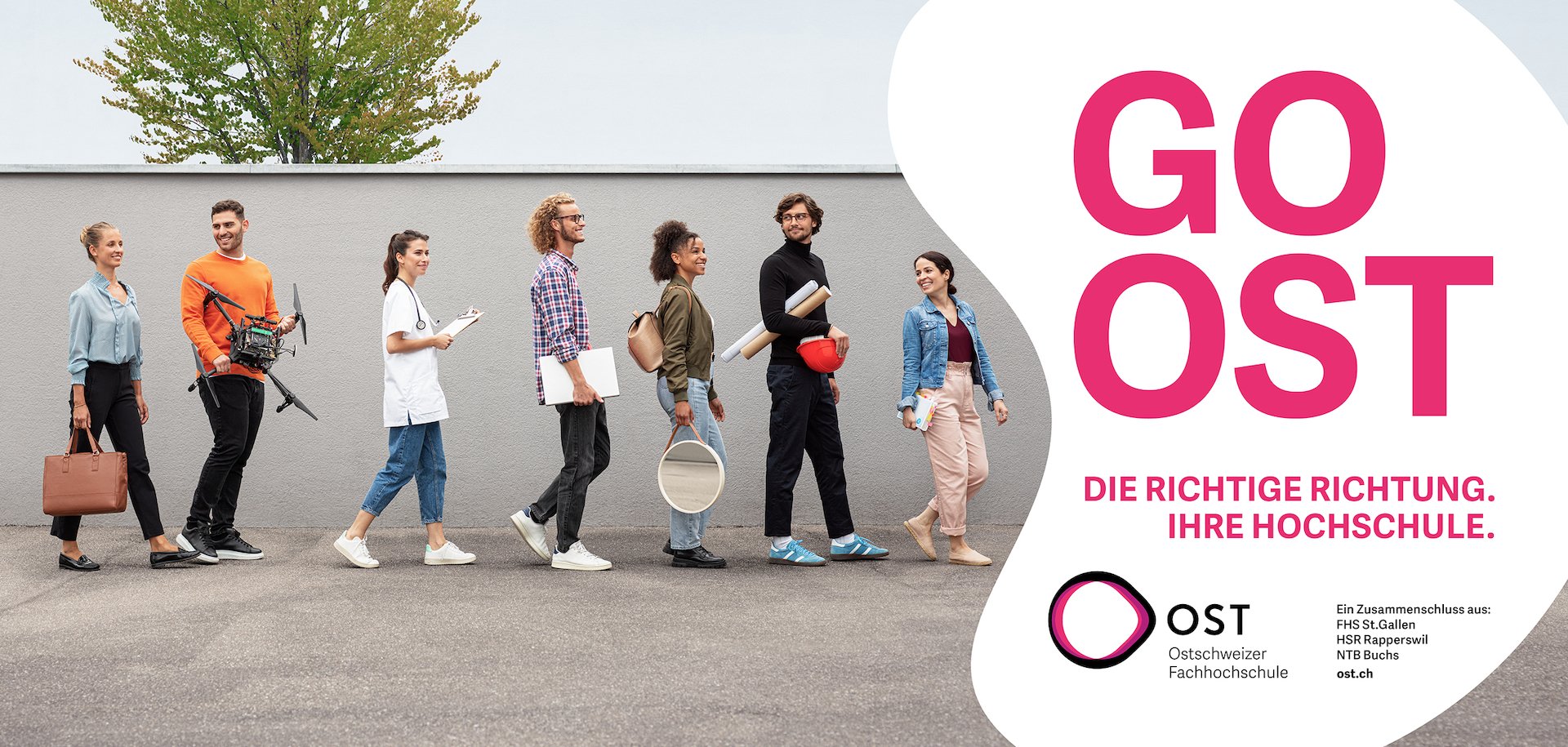 Um diesen Aufruf deutlich zu machen, haben wir mit dem Leitsatz «Go OST» nicht nur den perfekten Cheer für die Sportmannschaften der Ostschweizer Fachhochschule geschaffen, sondern auch einen ganz klaren Call To Action in die Kommunikation integriert. Dieser ist auf allen Werbemitteln prominent vertreten. Mit Plakaten, Inseraten, Onlinespots, Display-Ads sowie digitaler Aussenwerbung zeigen wir die Studierenden in einer jungen und nahbaren Bildsprache und heissen sie samt ihren Leidenschaften herzlich Willkommen. Ob Robotik, Gesundheit, Soziales oder Landschaftsdesign, an der OST findet jeder einen Platz ganz vorne in der Klasse. Damit sind die Studierenden an der OST nicht nur für ihr Studium bestens aufgehoben, sondern schlagen auch für die Zeit danach den richtigen Weg ein. Go OST!