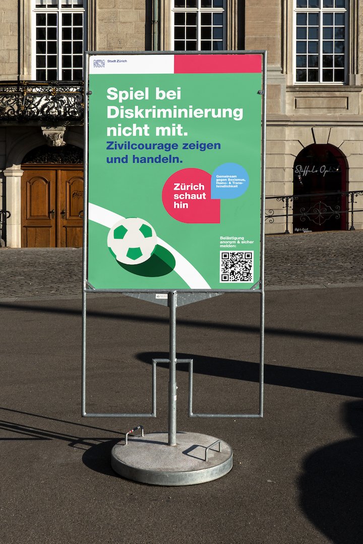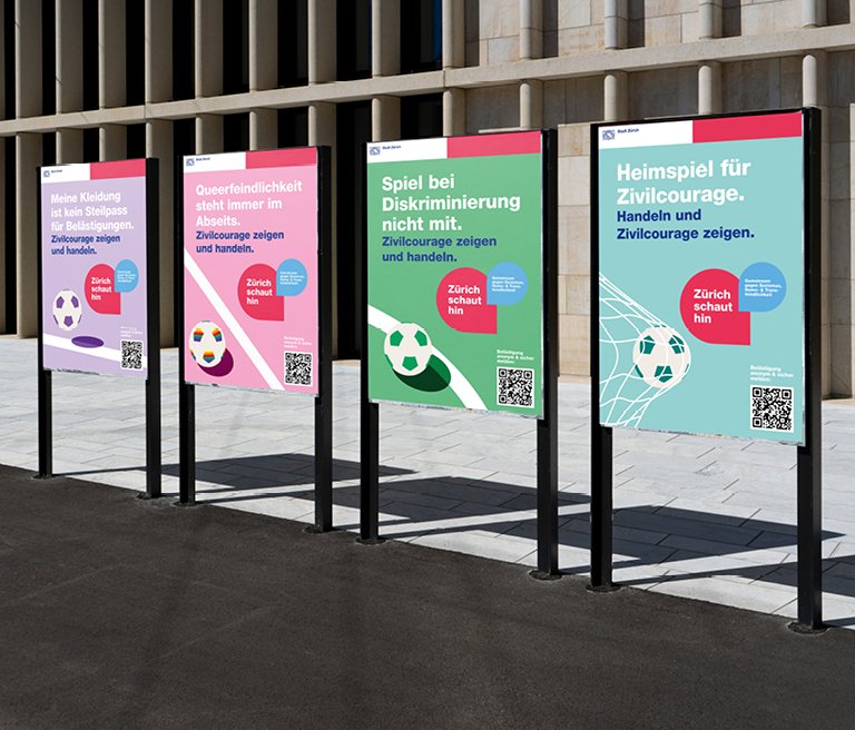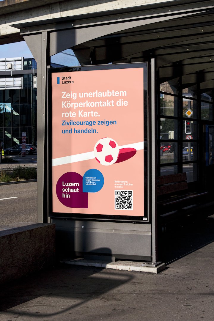 Diskriminierung und Sexismus hat in unserer Gesellschaft keinen Platz. Auch nicht auf und neben dem Fussball-Feld. Also kreierten wir 4 Keyvisuals, die den Betrachter:innen den Ball zu spielt und sie mittels Fussballaffinen Headlines zum couragierten Handeln bei sexistischen Übergriffen sowie Queer-Feindlichkeit ermutigt. Unter dem Motto «Zivilcourage zeigen und handeln» werden sie aufgefordert aktiv gegen selbstbeobachtete Vergehen und Anfeindungen vorzugehen und diese zu melden.