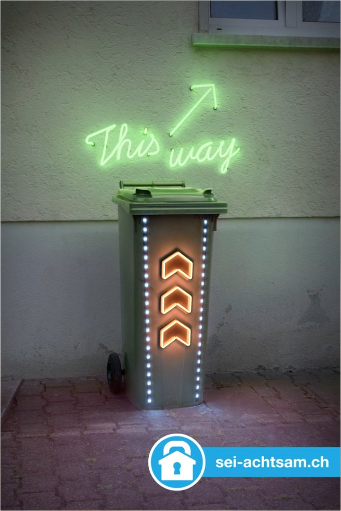 Sei achtsam – mit dieser Awareness-Kampagne haben wir der Stadtpolizei geholfen, potenzielle Einbrüche vorzubeugen. Harmlose Situationen wie eine zufällig platzierte Tonne unter einem gekippten Küchenfenster sind in den Augen eines Einbrechers eine Eingangstür mit Treppchen. Die Kampagne in kultiger Neon-Leuchtschrift hatte ihren ersten Auftritt an der Messe «Bau & Modernisieren» und machte anschliessend über die sozialen Medien auf den Umstand aufmerksam.