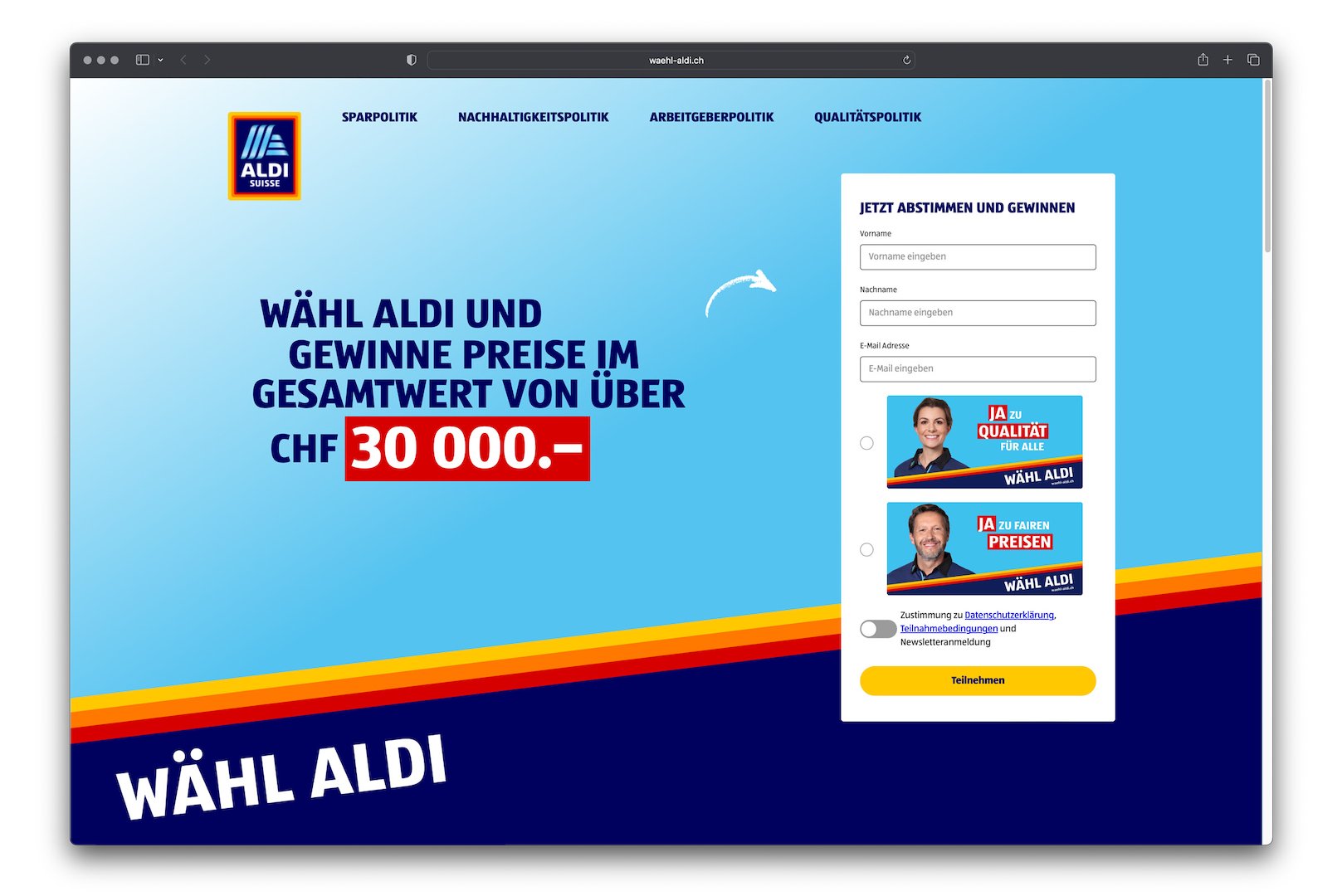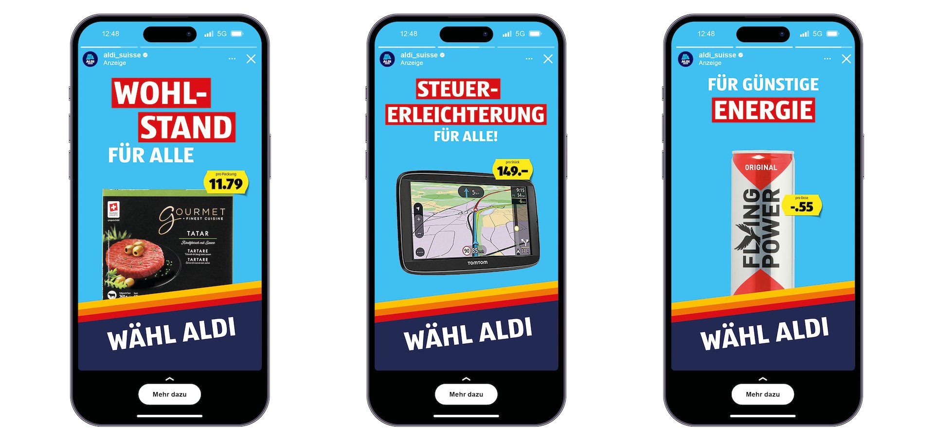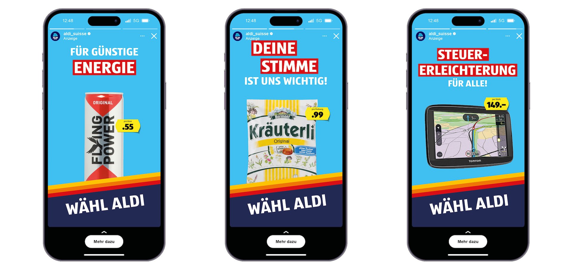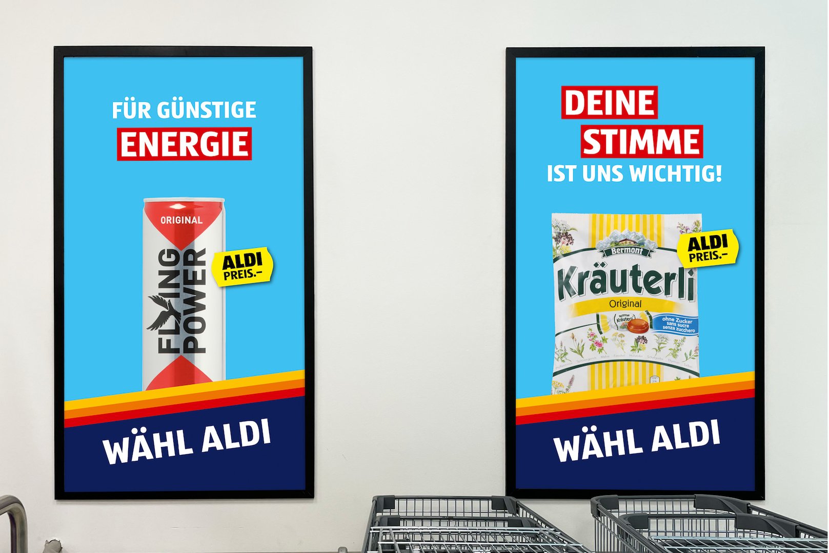 Die Sujets kamen in Form von Wahlplakaten, Display Ads sowie Social Media Ads unter die Schweizer Konsumentinnen und Konsumenten. Unterstützt wurde die Kampagne unter anderem durch Samplings, einen Wettbewerb mit Preisen im Gesamtwert von über CHF 30‘000.– sowie einer Landingpage, auf der das Wahlprogramm von ALDI SUISSE zu finden war. Weitere Kampagnen-Sujets mit ALDI SUISSE-Produkten folgten und kamen am POS und auf Social Media zum Einsatz. ALDI hat sich somit erfolgreich in den Wahlkampf 2023 «eingemischt» und konnte die Schweizer Wähler:innen – egal, ob links, rechts oder dazwischen, ob stimmberechtigt oder nicht – von sich überzeugen.