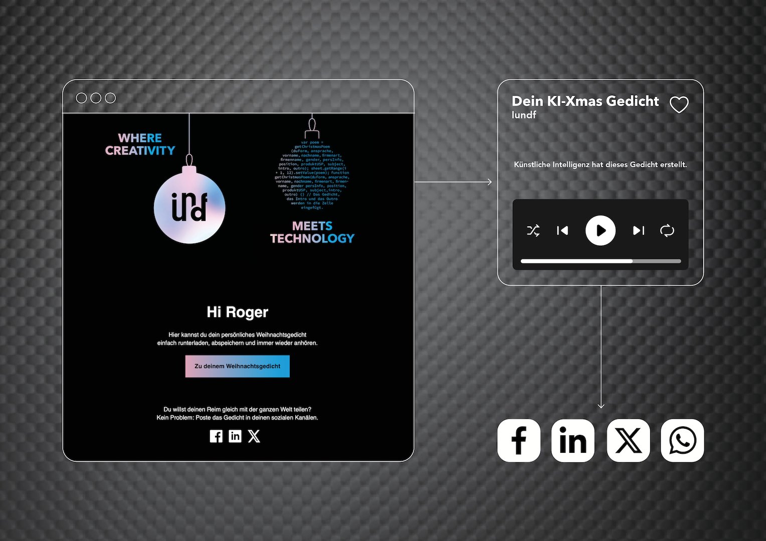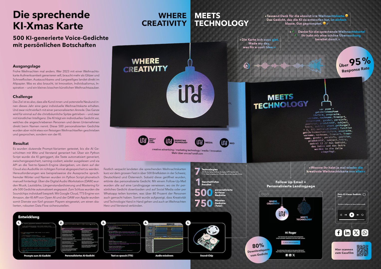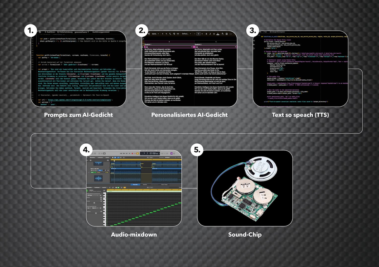 Es wurden Dutzende Prompt-Varianten getestet, bis die AI Geschichten mit Witz und Verstand generiert hat. Über ein Python Script wurde die KI getriggert, die Texte automatisiert generiert, zwischengespeichert, naming-codiert, wieder ausgelesen und via API an die Text-to-Speech-Engine übergeben, um dann auf der Cloud als Audiofile im richtigen Format abgespeichert zu werden. Herausforderungen, wie beispielsweise die Aussprache sprachfremder Wörter und Namen, wurden im Python Script phonetisch manuell hinterlegt. Über die Digital Audio Workstation (DAW) wurden Musik, Lautstärke, Längenstandardisierung und Mastering für alle 500 Gedichte automatisiert angepasst. Zum Schluss wurden die Soundchips individuell bespielt. Mit Google Cloud, TTS Engine von Amazon, der KI-API von Open AI und der DAW von Apple wurden somit Dienste von fünf grossen Playern eingesetzt, um einen skalierten, robusten Data Flow sicherzustellen. Festlich verpackt landeten die sprechenden Weihnachtskarten kurz vor dem grossen Fest in über 500 Briefkästen in der Schweiz, Deutschland und Österreich. Sobald diese geöffnet wurden, ertönte das personalisierte Gedicht. Somit wurde aufgezeigt, dass Kreativität und Technologie Hand in Hand gehen und auch an Weihnachten Herz und Verstand verbinden.